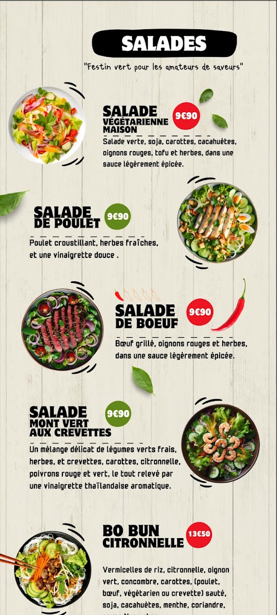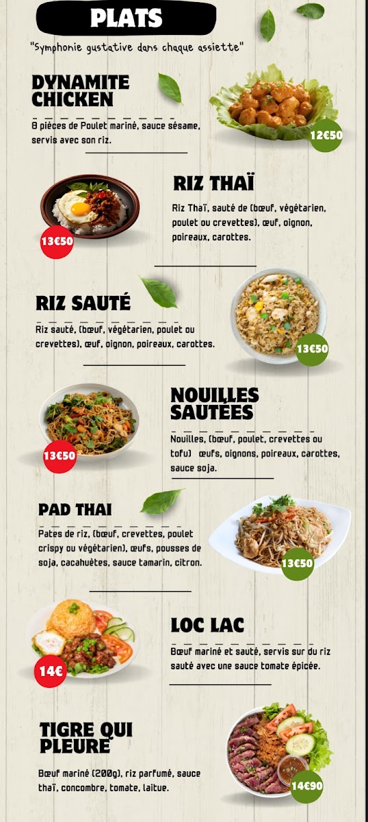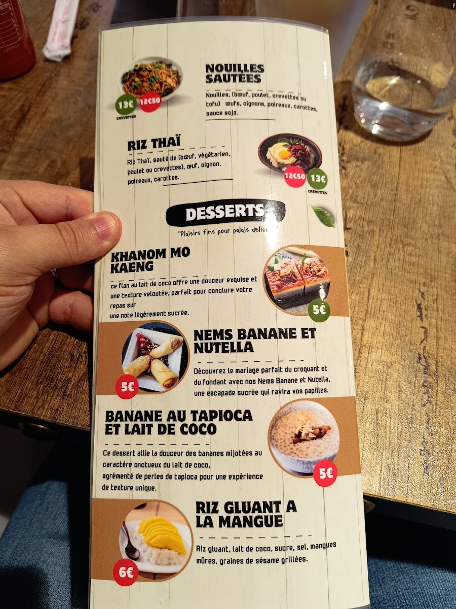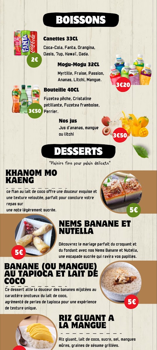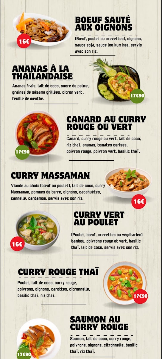 The menu at Le thaï yonnais features traditional Thai cuisine with a focus on main dishes such as noodles, curries, and rice-based meals. Typical offerings include options with beef, shrimp, and other proteins prepared with authentic Thai flavors.